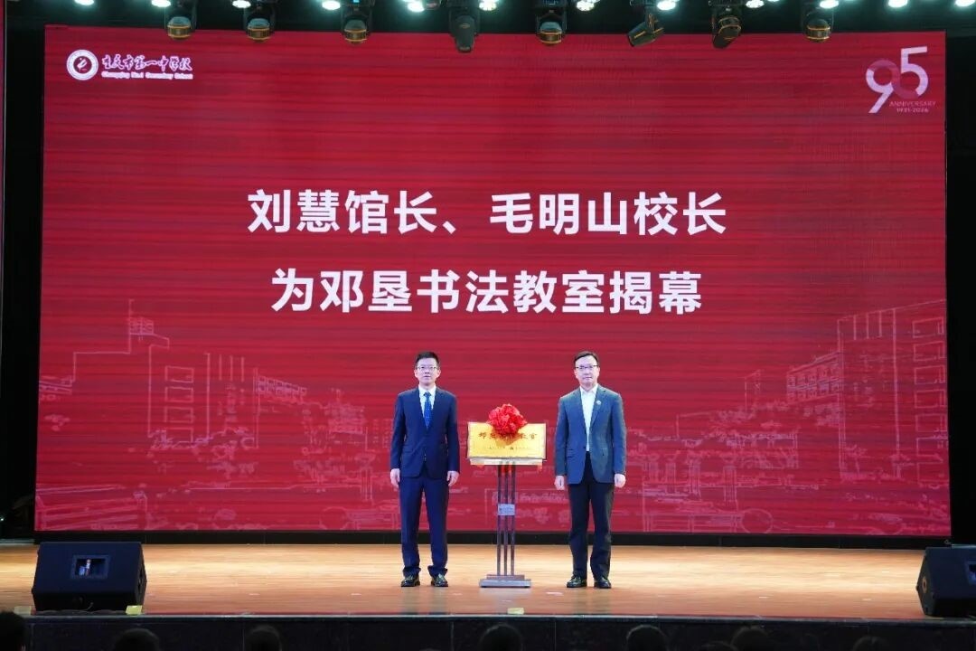 儀式上,鄧小平故居陳列館館長劉慧與重慶一中校長毛明山共同為“鄧墾書法教室”揭幕。劉慧代表陳列館向學校贈送了一份意義非凡的禮物——鄧墾老校長在95歲高齡時親筆創(chuàng)作的書法作品“奮進”。