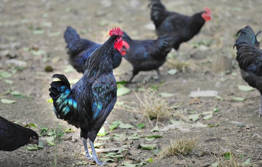 城口山地雞,重慶市城口縣特產(chǎn),全國農(nóng)產(chǎn)品地理標(biāo)志。城口山地雞體軀略偏長,胸部寬窄適中,羽毛較緊湊,顏色以黑(褐)色為主。公雞外觀威武雄壯,羽毛油亮,頭大小適中,單冠直立中等大小,冠肥潤、組織柔軟光滑,冠尖7-9枚,冠、耳葉、肉垂為紅色,喙多為蠟青色,稍彎曲,梳羽、蓑羽及主翼羽以火紅花羽為主,背長而直,胸骨長直,胸肌欠發(fā)達,腹部多為黑羽,尾羽黝黑上翹,少量的公雞梳羽部有絲羽,腿及脛較長,脛部和腳部為青色,脛、腳毛少見,皮膚白色。母雞單冠直立相對較淺,頭較小,冠、耳葉、肉垂為紅色,羽毛以黑色為主,梳羽部有少量點狀火紅花羽,尾羽上翹,體形清秀。虹彩多為銅黃色或黑褐色,喙多為蠟青色、微彎曲,長短適中;脛較短,脛、腳均為青色,脛、腳毛少見,臀部豐滿而廣闊,皮膚白色。