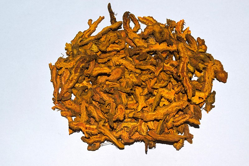 產(chǎn)品多集聚成簇,常彎曲,形如雞爪,故俗稱“雞爪連”,藥材商品為“味連”。表面灰黃色或黃褐色,粗糙,有不規(guī)則細節(jié)狀隆起、須根及須根殘基,有的節(jié)間表面平滑如莖干。上部多殘留褐色鱗片,頂部常有殘余的莖或葉柄。質(zhì)硬,斷面不整齊,皮部橙紅色或暗棕色,木部鮮黃色或橙黃色,呈放射狀排列,髓部有的中空。氣微,味極苦。