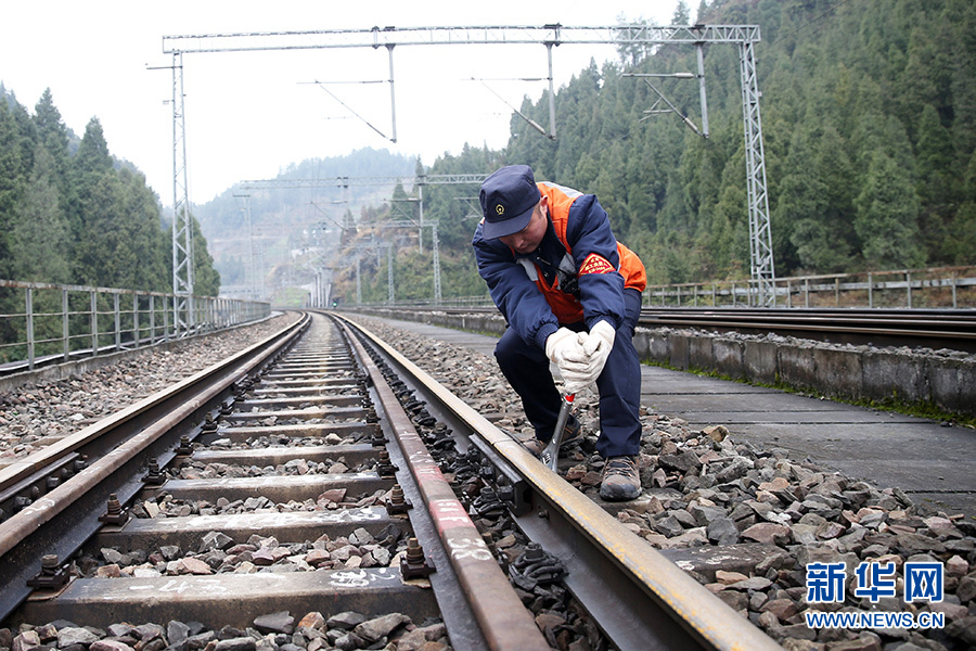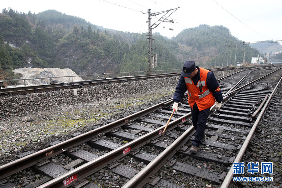 2月21日,在渝懷鐵路重慶黔江區(qū)段,中國成都鐵路局集團(tuán)公司涪陵工務(wù)段黔江線路車間魚泉工區(qū)工長何。ㄓ遥┖吐毠は蚴瘒跈z查軌道。新華網(wǎng)發(fā)(楊敏 攝) -