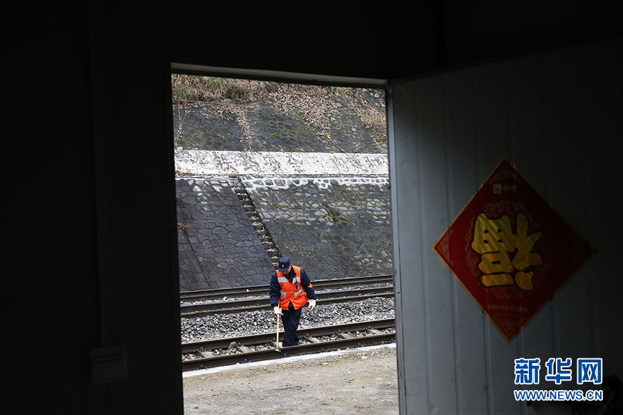 2月21日,在渝懷鐵路重慶黔江區(qū)段,中國成都鐵路局集團(tuán)公司涪陵工務(wù)段黔江線路車間魚泉工區(qū)工長何健在檢查工區(qū)住房前的軌道。新華網(wǎng)發(fā)(楊敏 攝) -