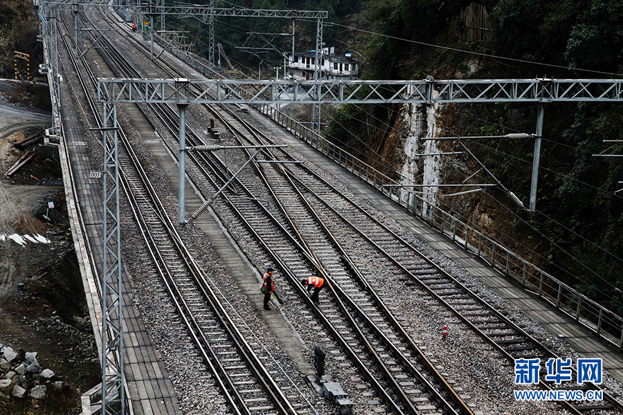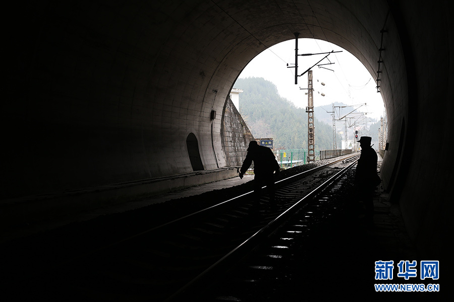 2月21日,在渝懷鐵路重慶黔江區(qū)段,中國成都鐵路局集團(tuán)公司涪陵工務(wù)段黔江線路車間魚泉工區(qū)工長何。ㄗ螅┖吐毠は蚴瘒谒淼纼(nèi)檢查軌道。新華網(wǎng)發(fā)(楊敏 攝) -