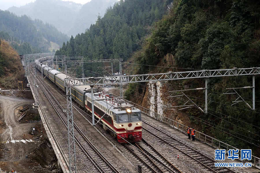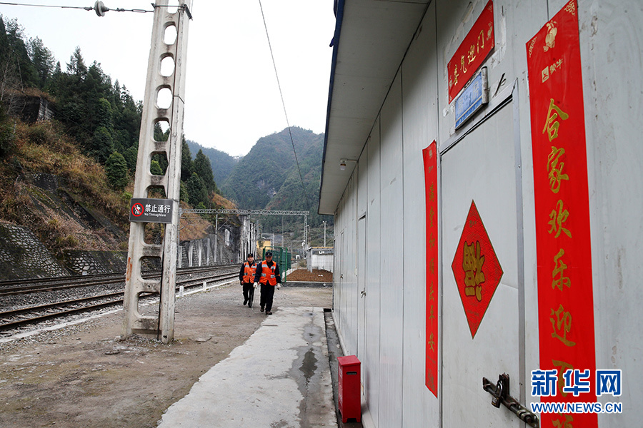 2月21日,在渝懷鐵路重慶黔江區(qū)段,中國成都鐵路局集團(tuán)公司涪陵工務(wù)段黔江線路車間魚泉工區(qū)工長何。ㄓ遥┖吐毠は蚴瘒嘘(duì)迎接列車。新華網(wǎng)發(fā)(楊敏 攝) -