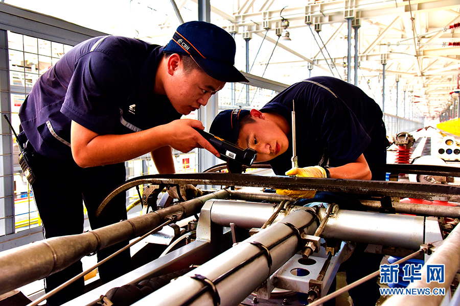 重慶西動(dòng)車所的檢修庫內(nèi),動(dòng)車組機(jī)械師正在檢修受列車電弓。新華網(wǎng)發(fā)(陳亞攝)