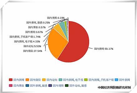 中國經(jīng)濟網(wǎng)輿情研究所監(jiān)測數(shù)據(jù)顯示,2015年1月1日至12月25日共監(jiān)測到相關(guān)新聞報道13716條,博客129篇,論壇1052條,微博24014條,微信6936條。從該事件的網(wǎng)絡(luò)輿情占比圖可以看出,新聞媒體,以及微信、微博等自媒體對其討論較多,而博客和論壇的相關(guān)討論較少。