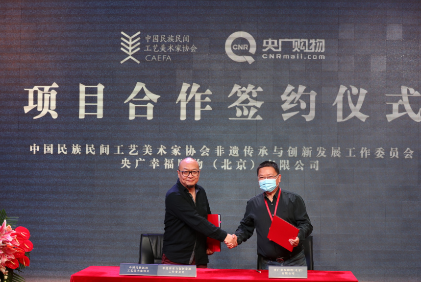 央廣購(gòu)物同中國(guó)民族民間工藝美術(shù)家協(xié)會(huì)非遺傳承與創(chuàng)新發(fā)展工作委員會(huì)簽署合作協(xié)議(蘆迪 攝 央廣網(wǎng)發(fā))