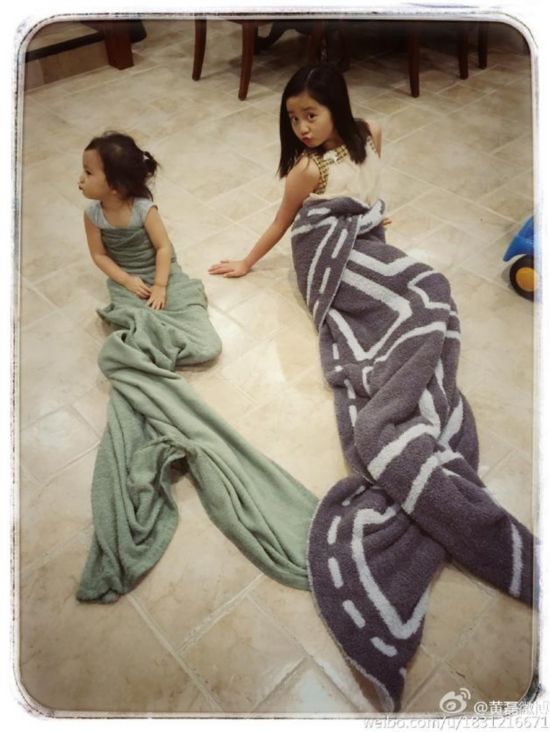 8月18日晚,黃磊更新微博曬一雙女兒搞怪照,并寫道:“家里來了兩條小美人魚……”照片中,多多和妹妹坐在地上,身上裹著大大的毛巾,還用毛巾的邊角擺成魚的剪刀尾巴,兩姐妹扭頭嘟嘴賣萌,十分的可愛。
