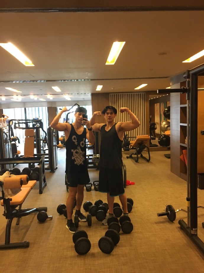 魏晨30日微博曬出與彭于晏的健身照,他稱:兩個無聊的宅炮兒…相約減肥。