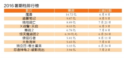今年暑期檔,票房排在前6位的影片票房均過6億元,但破10億元的電影僅有一部《魔獸》,最終票房難以和去年的冠軍匹敵。眾多業(yè)內人士都表示,今年暑期檔缺乏“爆款”的現(xiàn)象級電影。