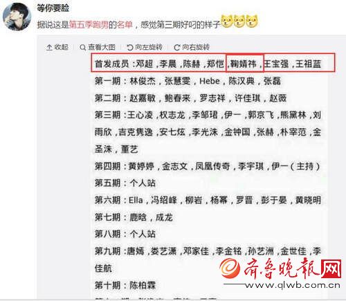 對此,《跑男》推廣總監(jiān)如夢堯10月4日下午發(fā)文否認,而鞠婧祎也發(fā)文,疑似撇清炒作嫌疑。藝人邀請方面,肯定不是《跑男》原班人馬,但是嘉賓中肯定有鹿晗,《跑男》真的是一季不如一季,特別是各大真人秀都紛紛而至的時候,《跑男》總感覺后勁不足,而且很假。