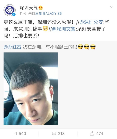 孫紅雷曬自拍叫板網(wǎng)友 深圳公安官博調(diào)侃:別搞事