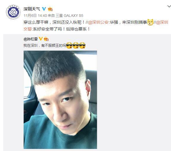 孫紅雷11月4日曬出的自拍照,日前卻被各路官方微博“調(diào)戲”了。孫紅雷曬出的自拍中,稱自己人在深圳,并“叫板”網(wǎng)友:“有不服顏王的嗎”。隨后,深圳交警支隊(duì)官博轉(zhuǎn)發(fā)并“批評”:“系好安全帶了嗎!后排也要系!”深圳公安官博也來湊熱鬧:“華強(qiáng),來深圳別搞事”。連深圳天氣的官博也出來指正:“穿這么厚干嘛,深圳還沒入秋呢!”