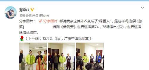11月28日下午,劉曉慶在微博中曬出一組自己的演出花絮,復(fù)古的造型配上這個(gè)綠色羽絨服,滿滿的穿越感, 劉曉慶的朋友還調(diào)侃她變身“綠巨人”,這也引得劉曉慶發(fā)微博喊冤,她配文稱:“都說我穿這件外衣變成了綠巨人,是這樣嗎?”