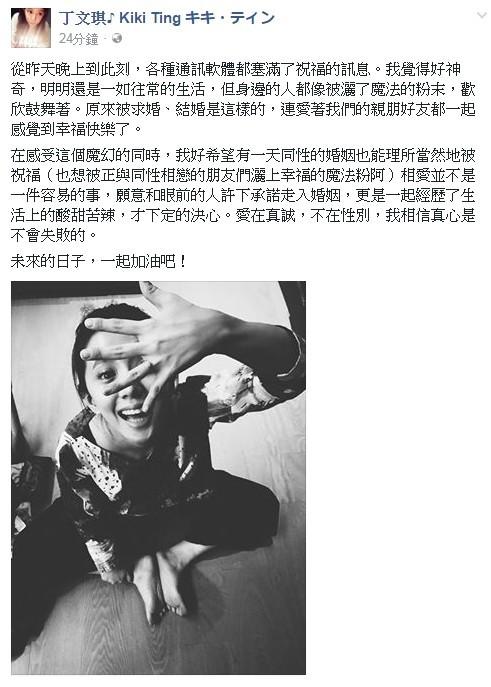 除了感受自己即將結(jié)婚的魔幻心情,丁文琪不忘提到最近熱議的同性婚姻,期盼有一天同志也能理所當(dāng)然地被祝福,“相愛并不是一件容易的事,愿意和眼前的人許下承諾走入婚姻,更是一起經(jīng)歷了生活上的酸甜苦辣,才下定的決心。愛在真誠,不在性別,我相信真心是不會失敗的!