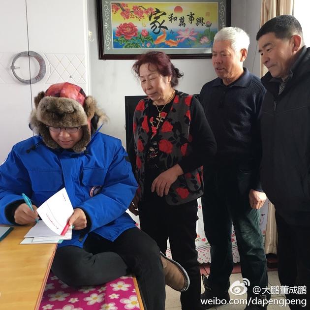 12月5日,大鵬曬坐在炕上為鄉(xiāng)親們簽名的照片,并稱:“見面會!”照片中,大鵬身穿藍(lán)色上衣,頭戴雷鋒帽,盤腿坐在炕上簽名,頗具村干部風(fēng)范。