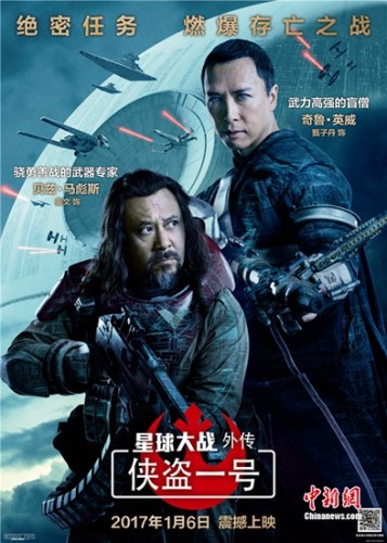 中新網(wǎng)12月23日電 由盧卡斯影業(yè)制作,迪士尼影業(yè)發(fā)行的《星球大戰(zhàn)外傳:俠盜一號(hào)》(Rogue One: A Star Wars Story)于2016年12月16日北美開(kāi)畫,全球上映首周票房勁收近3億美元,并收獲大量盛贊,而在一眾主演得到的評(píng)價(jià)中,兩位中國(guó)主角——甄子丹、姜文在片中的精彩演繹大獲好評(píng)。