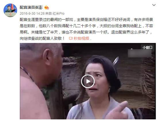 據(jù)悉,配音演員張澎曾于去年9月微博點(diǎn)名保劍鋒拍戲時(shí)以數(shù)字代替臺(tái)詞,稱劇中“大段臺(tái)詞全靠我給配上”。張澎曾為《鹿鼎記》《新版水滸傳》《大唐游俠傳》等多部影視作品配音,并于2003年在電視劇《永樂(lè)英雄兒女》中為保劍鋒所飾演的馮天賜一角配音。但保劍鋒微博表示,他“不認(rèn)識(shí)”張澎,更稱張澎出言詆毀自己是“滿嘴胡言”。