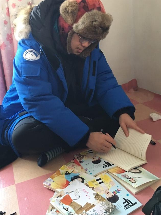埋頭簽名,而大鵬面前散落著的待簽本,封面卻是Angelababy、趙麗穎和TFBOYS的照片。大鵬配文調(diào)侃道,“為老鄉(xiāng)們簽名,在Baby、麗穎、TFboys的本子上簽上了他們的名字!