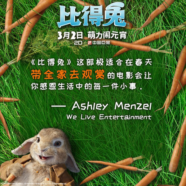 3月2日,《比得兔》將以2D和中國巨幕的制式登陸內(nèi)地銀幕。