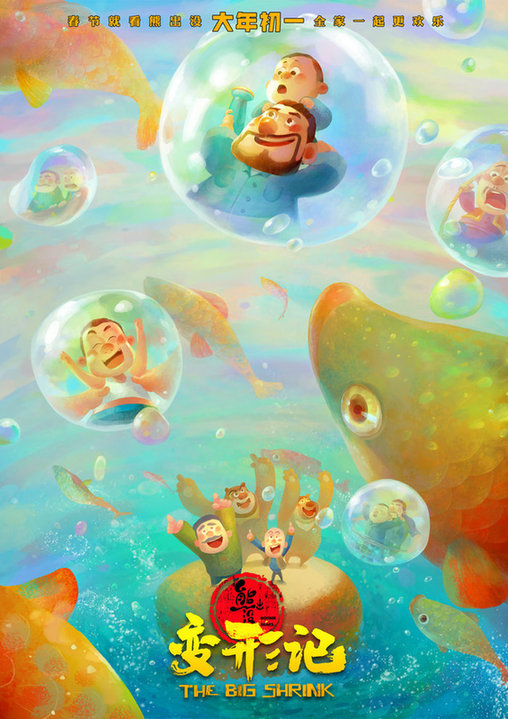 “童話”版海報描繪了光頭強父子與熊大熊二幫助麻哈魚“歸家”的溫暖場面。有趣的是,泡泡中光頭強父子集體“縮小”,點出了電影“變形記”的概念;同時海報中也描繪了光頭強父子倆相處的代表性畫面。例如:小時候父子親昵相依;長大后強爸忙于工作、疏于和孩子溝通造成父子之間的疏遠。海報深化了影片的“親子”主題,呼吁現(xiàn)實生活中子女與父母之間,彼此多些理解和關懷。