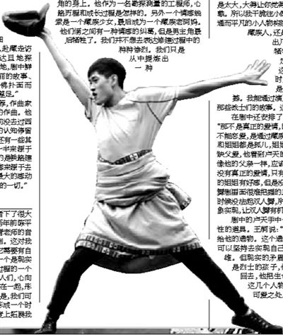 在劇中還安排了一條隱晦的情感線,王舸說:“那不是真正的愛情,因為男主人公盧天是士兵,他不能戀愛,是通過藏族弟弟的想象來實現(xiàn)的。弟弟和姐姐都是孤兒,姐姐承擔(dān)了母親的責(zé)任,但是他缺父愛,他看到盧天的時候,就覺得大哥哥應(yīng)該是像他的父親一樣,應(yīng)該能跟姐姐好。其實從頭到尾沒有真正的愛情,只有好感,對藏族的孤兒,對藏族的姐姐有好感,但是沒有真正產(chǎn)生愛情。這也是在舞劇里面很難把握的東西,因為舞劇不產(chǎn)生愛情的時候沒法起雙人舞,所以我只能通過這個弟弟的想象實現(xiàn),讓雙人舞有機會呈現(xiàn)!
