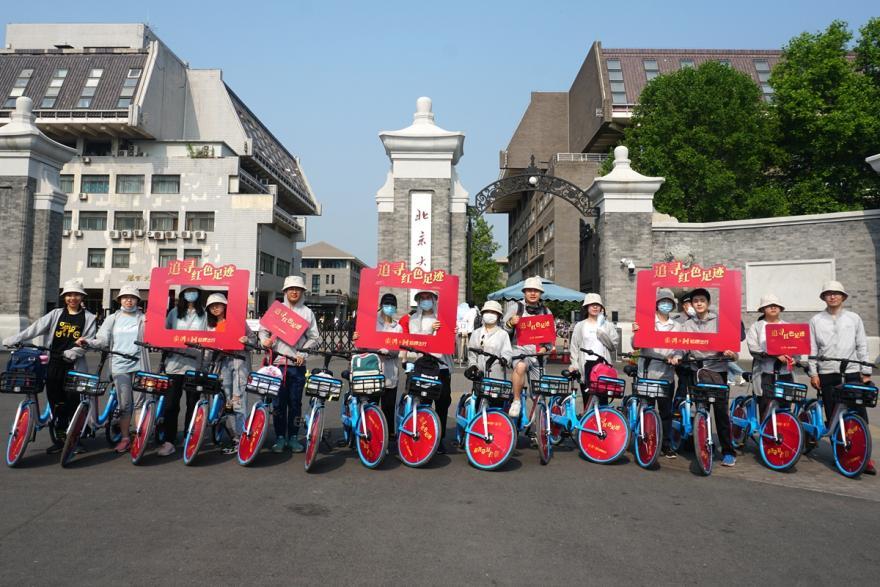 參與“初心之路”騎行活動的北大車協(xié)成員在校門口合影
