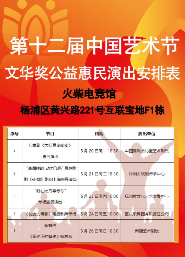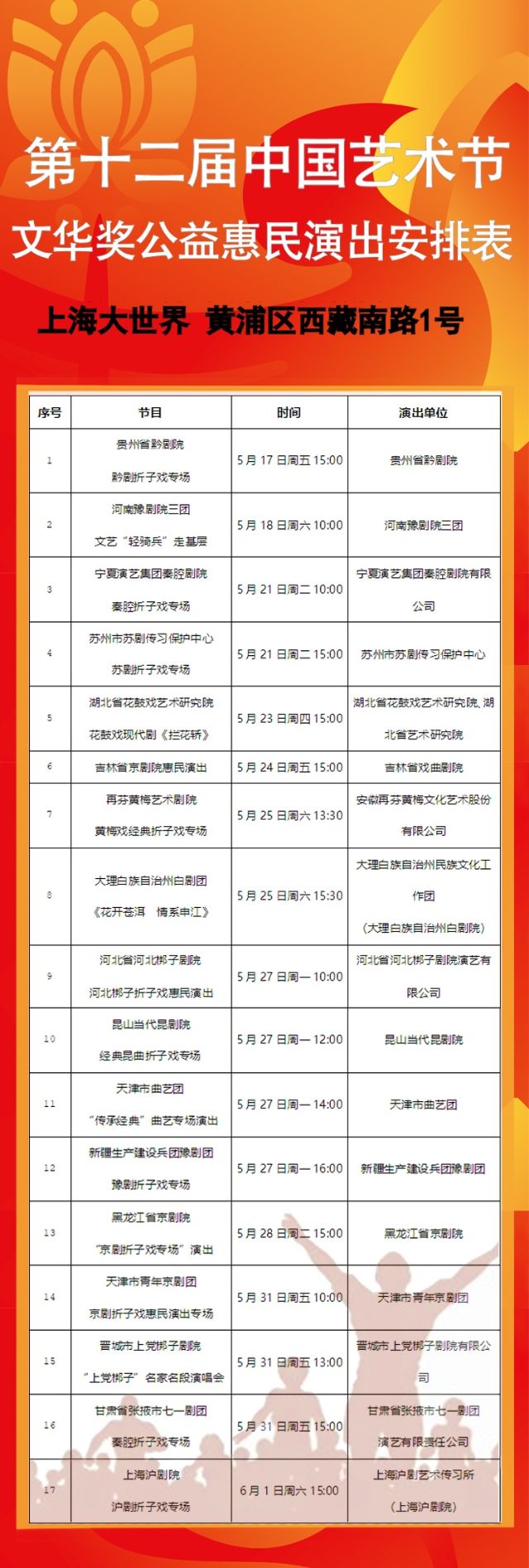 本次文華獎(jiǎng)惠民演出將于5月17日至6月1日期間,在上海大世界、中山公園、火柴電競館三個(gè)場地上演34場。為方便廣大觀眾積極參與,此次文華獎(jiǎng)惠民演出活動(dòng)的參與方式為線上免費(fèi)預(yù)約,觀眾可于即日起在十二藝節(jié)官網(wǎng)(www.the12caf.cn)或于5月8日起登錄大麥網(wǎng)十二藝節(jié)購票專題頁關(guān)注劇目演出信息并完成線上演出預(yù)約。預(yù)約中山公園及火柴電競館演出的觀眾可于當(dāng)天直接憑二維碼掃碼入場,預(yù)約大世界演出的觀眾須憑短信在大世界3號入口領(lǐng)票入場。