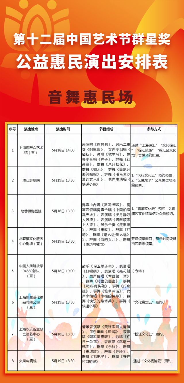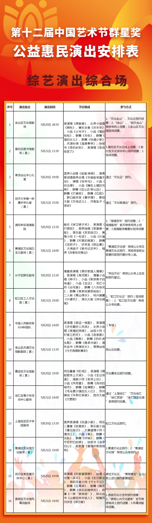 群星獎(jiǎng)惠民演出將于群星獎(jiǎng)評比期間5月18日至21日深入16個(gè)區(qū),舉行24場惠民演出。84個(gè)決賽參演團(tuán)隊(duì),連續(xù)四天,走進(jìn)企業(yè)、社區(qū)、部隊(duì)、學(xué)校、旅游景點(diǎn),盡可能滿足更多觀眾的觀摩需求,將群星獎(jiǎng)成果與不同人群分享。本次惠民演出由16個(gè)區(qū)參與承接運(yùn)營,除個(gè)別部隊(duì)專場不對外開放預(yù)約外,其余場次各區(qū)居民皆可通過各區(qū)相關(guān)微信公眾號或文化云進(jìn)行預(yù)約,具體預(yù)約時(shí)間請關(guān)注相關(guān)公眾號或文化云。與此同時(shí),群星獎(jiǎng)還有13場惠民演出通過國家文化云和文化上海云進(jìn)行現(xiàn)場直播(表格中標(biāo)注“直”),讓全國更多觀眾共享群星盛事。