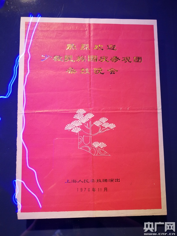 這個展覽會別開生面、非同一般,墻上全部是一本本演出的手冊,有海報式的、有說明書式的,徜徉在其中仿佛走進了濃縮的上海舞臺的歷史時光隧道!盁崃覛g迎少數(shù)民族國慶參觀團雜技晚會 上海人民雜技團演出 1978年11月”等海報訴說著民族團結(jié)的深情厚誼。