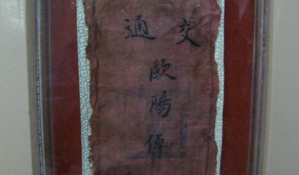在井岡山革命博物館的展室里陳列著一份不同尋常的紅色交通證。這份交通證用紅綢布制作,長(zhǎng):12cm,寬:7.5cm,證件上寫有“交通歐陽(yáng)倬”五字。
