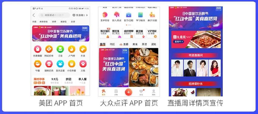 美團(tuán) 作為國(guó)內(nèi)影響力較大的的生活服務(wù)類平臺(tái),服務(wù)宣傳宗旨為“吃喝玩樂全都有”,除了為“紅動(dòng)中國(guó)”美食直播周 提供美團(tuán)APP、大眾點(diǎn)評(píng)APP等首頁(yè)廣告資源位置、給予直播間定向流量支持以外,還將全程為直播周提供直播運(yùn)營(yíng)和技術(shù)支持,全面提升整場(chǎng)直播周活動(dòng)的規(guī)模和檔次。