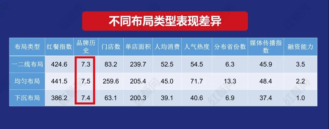 一二線布局的品牌,紅餐指數(shù)居中,品牌勢能并不是它們最大的優(yōu)勢,它們更傾向于面積較大的門店和相對較高的人均消費,比較重視品牌在媒體上的傳播,同時具有很強的融資能力。