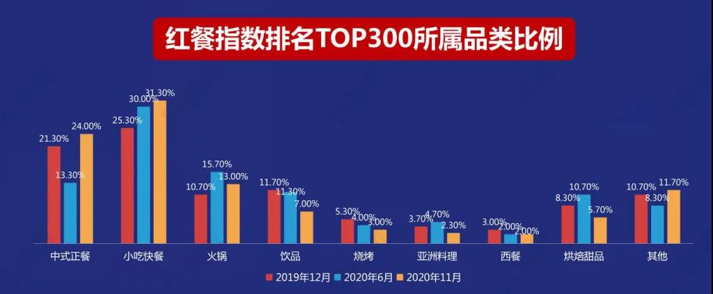 從紅餐指數(shù)排名前300名品牌所屬品類比例的變化可以看出,疫情對于中式正餐的沖擊是比較大的,今年6月其在紅餐指數(shù)TOP300中的席位比例從去年12月的21.3%劇減至13.3%,比例波動幅度是所有品類中最大的,但是到了今年11月,其席位比例已經(jīng)回升至24.0%,可以用“王者歸來”形容。