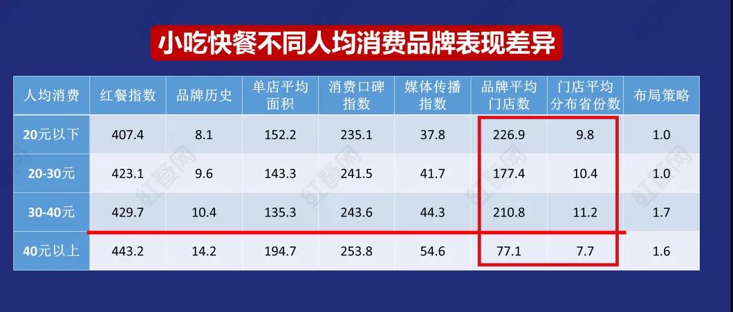 通過對小吃快餐人均消費區(qū)間的研究,樊寧透露 了一個“40元分界線現(xiàn)象”,即以40元人均消費劃線,40元以下和40元以上的小吃快餐品牌在多個指標(biāo)維度上的表現(xiàn)呈現(xiàn)出截然不同的特征。