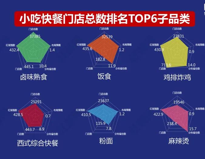 此外,雞排炸雞、鹵味熟食和西式綜合快餐的門店數(shù)在小吃快餐中位列前三甲,其中雞排炸雞的門店數(shù)一馬當(dāng)先。而在品牌平均分布省份數(shù)中,雞排炸雞和麻辣燙處于第一梯隊,鹵味熟食和飯食處于第二梯隊;布局策略層面,鹵味熟食數(shù)值略高,其他五個子品類都是典型的平均布局型,適應(yīng)能力極強。