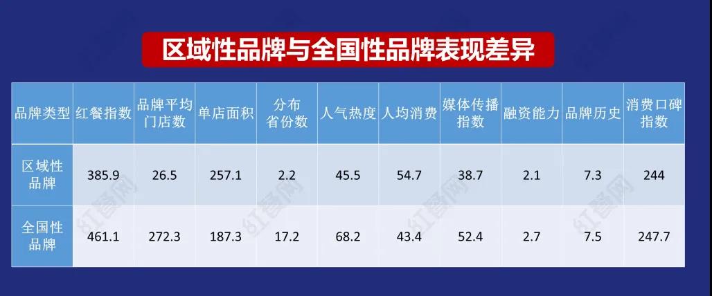 和區(qū)域性品牌相比,全國性品牌擁有更高的紅餐指數(shù),也意味著其品牌勢能總體要高出一截,同時全國性品牌的平均門店數(shù)是區(qū)域性品牌的大約10倍,門店分布省份數(shù)、人氣熱度、媒體傳播指數(shù)也是大幅領(lǐng)先,融資能力略有優(yōu)勢。而區(qū)域品牌更加傾向于中型以上門店,并在人均消費上略高一點。 樊寧認(rèn)為,就發(fā)展現(xiàn)狀來說,區(qū)域品牌呈現(xiàn)占山為王,南下東進的態(tài)勢,而全國性品牌則更傾向于夯實壁壘,以退為進,以守為攻。