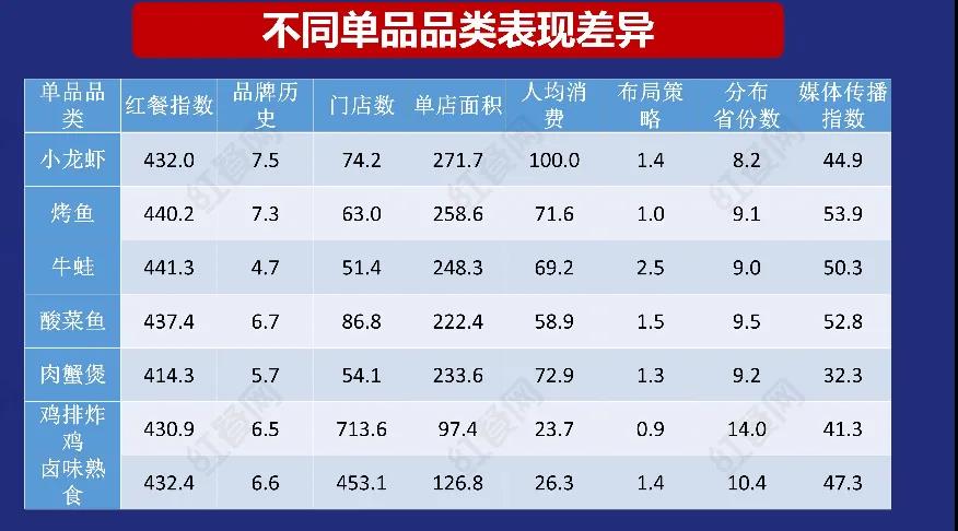 小龍蝦品類的特點是,品牌平均存續(xù)時間較長,單店面積較大,人均消費較高,門店擴張能力中等?爵~品類品牌平均存續(xù)時間也較長,媒體傳播力最強,和雞排炸雞品牌一樣,是非常典型的均勻布局型品類,遍布中國各級別城市。 牛蛙品類是最偏好一二線布局策略的單品品類,品牌平均門店數(shù)相對比較低,擴張能力一般。、