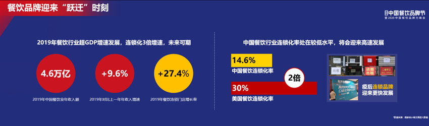 左下角這個(gè)圖是中國(guó)餐飲消費(fèi)的變化趨勢(shì)。2019年中國(guó)餐飲已經(jīng)做到4.6萬億的市場(chǎng);年同比增長(zhǎng)是9.6%,2019年中國(guó)的GDP增長(zhǎng)才是6.1%,中國(guó)餐飲的增長(zhǎng)速度超過了GDP的增長(zhǎng)速度;而2019年餐飲連鎖門店的增長(zhǎng)率是在27.4%。