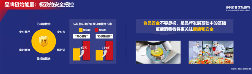 食品安全是現(xiàn)在非常重要的話題,左邊的數(shù)字是疫情期間,美團(tuán)迅速在美團(tuán)APP和大眾點(diǎn)評(píng)APP的頁面上推出的一個(gè)“安心餐廳”標(biāo)簽。這個(gè)標(biāo)簽說明該餐廳的員工、食材和衛(wèi)生標(biāo)準(zhǔn)都經(jīng)過了一系列的檢驗(yàn),合格了。