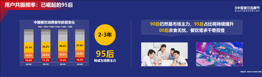 從線上的數(shù)據(jù)可見,下面暖色系的是“90后”、“95后”以及“00后”,這類消費(fèi)者已經(jīng)占了65%之多,65%的消費(fèi)者在線上進(jìn)行消費(fèi)選擇和決策,對(duì)于這些消費(fèi)者的關(guān)注以及對(duì)于這些消費(fèi)者未來可能性的關(guān)注,也將成為未來餐廳需要關(guān)注或者需要做儲(chǔ)備的力量。