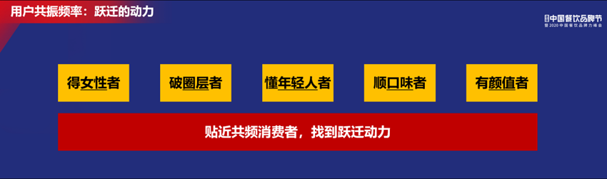 要想與消費(fèi)者發(fā)生共振,總結(jié)起來無非三點(diǎn)第一,得女性者,女性消費(fèi)占比那么高;第二,破圈層者,我們?cè)诟鱾(gè)圈層中能夠解決圈層消費(fèi)者的喜好,或者抓到他們的特征;第三,懂年輕人者,年輕人消費(fèi)者占到65%以上,懂年輕人的餐廳有更多的未來。