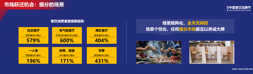 從線上消費(fèi)者的搜索趨勢(shì)來說,有6個(gè)關(guān)鍵詞:社交餐廳、有氣氛餐廳、網(wǎng)紅餐廳、一人食、撥草/喜提、輕奢。