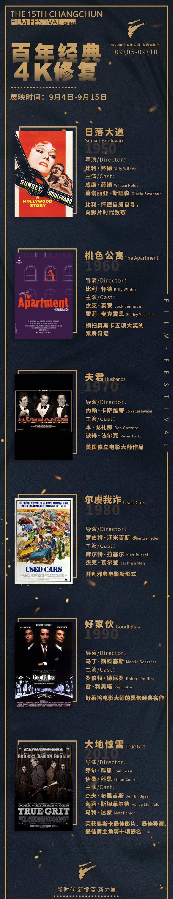 每年全世界各大電影節(jié)的經(jīng)典電影修復(fù)單元都會(huì)成為“重頭戲”,今年長(zhǎng)春電影節(jié)也將推出萬(wàn)眾期待的“百年經(jīng)典 4K修復(fù)”單元。本次4K修復(fù)展映單元將回顧歷史,不忘初心,以電影的名義,以最新的修復(fù)技術(shù),向經(jīng)典老片和杰出影人致敬。其中,既包括比利·懷德的《桃色公寓》,也有馬丁·斯科塞斯的《好家伙》等在內(nèi)的眾多經(jīng)典作品。