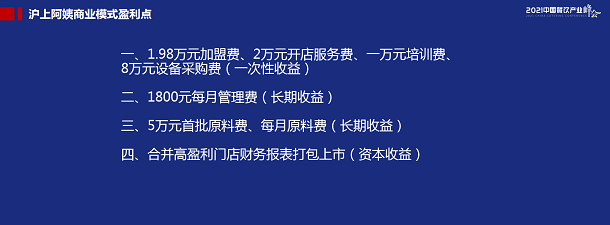 滬上阿姨的商業(yè)模式盈利點(diǎn)主要有四個(gè),其中,1.98萬(wàn)元的加盟費(fèi)、2萬(wàn)元開(kāi)店服務(wù)費(fèi)、1萬(wàn)元培訓(xùn)費(fèi)、8萬(wàn)元設(shè)備采購(gòu)費(fèi),是一次性收益。每月1800元的管理費(fèi)用,是長(zhǎng)期收益。5萬(wàn)元的首批原原料費(fèi),每月原料費(fèi),也是長(zhǎng)期收益。合并高盈利門(mén)店財(cái)務(wù)報(bào)表打包上市,這是資本收益。它就是靠這些來(lái)賺錢(qián)的。