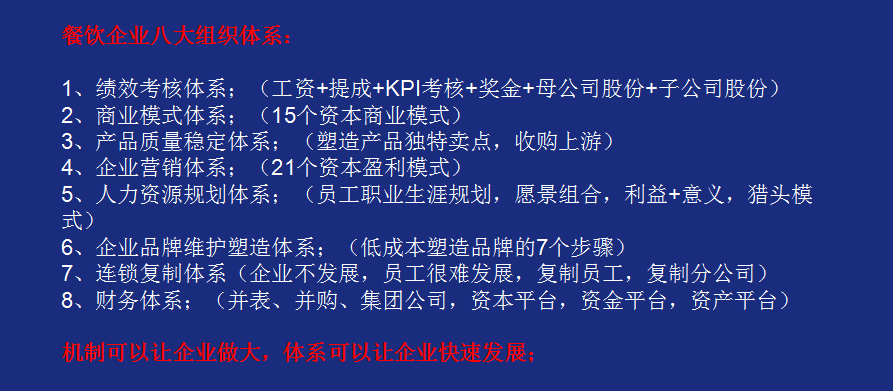 未來(lái),餐飲企業(yè)要高利潤(rùn)成長(zhǎng),要把八大系統(tǒng)做好,績(jī)效考核系統(tǒng)、商業(yè)模式系統(tǒng)、產(chǎn)品質(zhì)量穩(wěn)定系統(tǒng)、企業(yè)營(yíng)銷(xiāo)系統(tǒng)、人力資源規(guī)劃系統(tǒng)、企業(yè)品牌維護(hù)塑造系統(tǒng)、連鎖復(fù)制系統(tǒng)、財(cái)務(wù)系統(tǒng)。