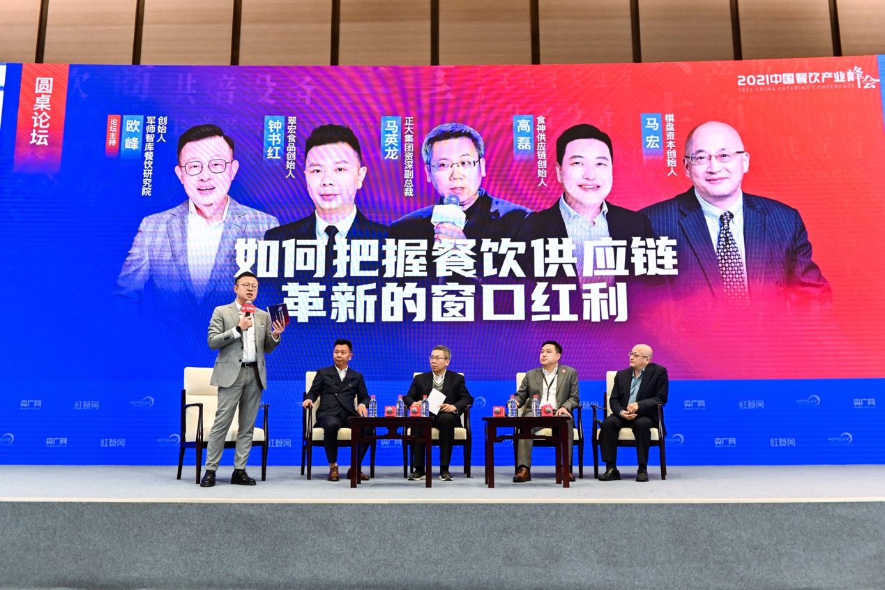 “如何把握餐飲供應(yīng)鏈革新的窗口紅利”圓桌論壇,則特別邀請了軍師智庫餐飲研究院創(chuàng)始人歐峰主持,翠宏食品創(chuàng)始人鐘書紅、正大集團(tuán)資深副總裁馬英龍、食神供應(yīng)鏈創(chuàng)始人高磊、棋盤資本創(chuàng)始人馬宏進(jìn)行了分享。