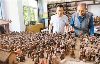 苗春生和女婿在一起探討泥塑創(chuàng)作 記者 翟小雪 攝