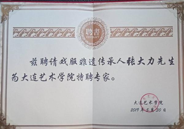 2019年5月31日,非遺專家、百年戲衣傳承人張大立老師蒞臨大連藝術(shù)學(xué)院為服裝學(xué)院師生帶來了一場關(guān)于傳統(tǒng)京劇戲裝的視聽盛宴。張大立,1979年隨父在沈陽中街劇裝戲具廠學(xué)習(xí)戲裝設(shè)計(jì),得到了戲裝大師陳道渤的悉心指點(diǎn),全面繼承了戲裝設(shè)計(jì)、刺繡、盔頭、把子、靴鞋及戲劇人物的服飾配套等手藝。跟隨二位前輩為東三省劇團(tuán)服務(wù)多年,他的作品得到了馬長禮、馬崇仁、畢古云、李麟童、周仲博及評(píng)劇界韓少云、花淑蘭、筱俊亭等老藝術(shù)家的稱贊。授課開始之前服裝學(xué)院張志宇院長對(duì)張大立老師進(jìn)行介紹并為張老師頒發(fā)聘書。