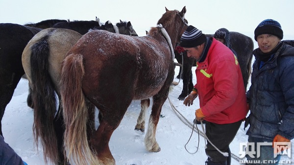 “馬拉漁網(wǎng)、鑿冰捕魚”,是當?shù)孛晒抛鍧O民世代沿襲的勞作。馬兒半夜就一頭扎進黑夜,一路奔波,汗液凝結(jié)為霜粘在毛皮上,讓趕馬的人甚是心疼。雖為牲畜、情似伙伴。