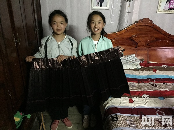 圖為王奕(右)、王雅嫻(左)姐妹倆展示長(zhǎng)輩為她們制作的裙裝